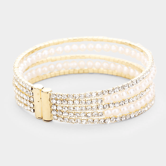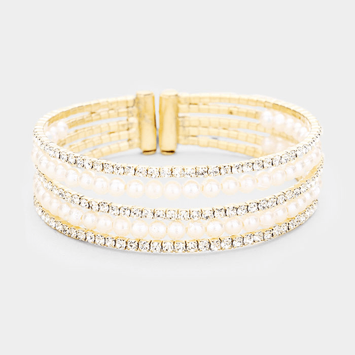 Wear this pearl statement, gold and rhinestone accented bracelet with class to any gala, wedding parties or even prom.