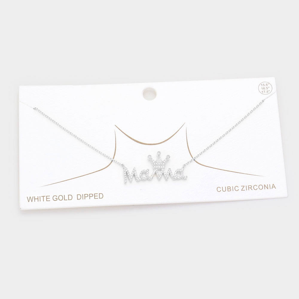 White Gold Dipped CZ Crown MAMA Message Pendant Necklace