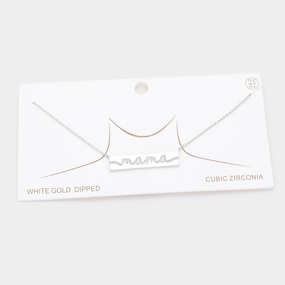 White Gold Dipped CZ MAMA Message Metal Bar Pendant Necklace