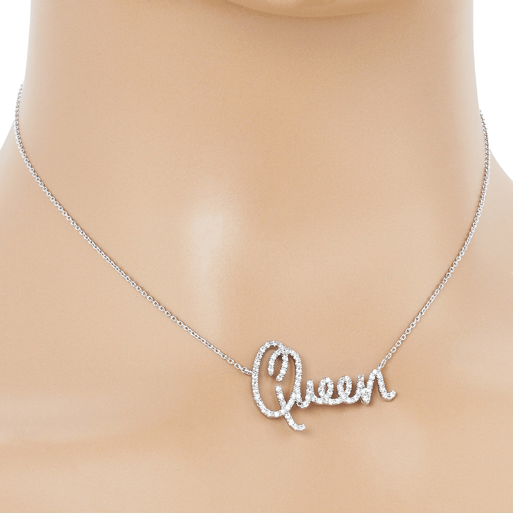 White Gold Dipped CZ Queen Message Pendant Necklace